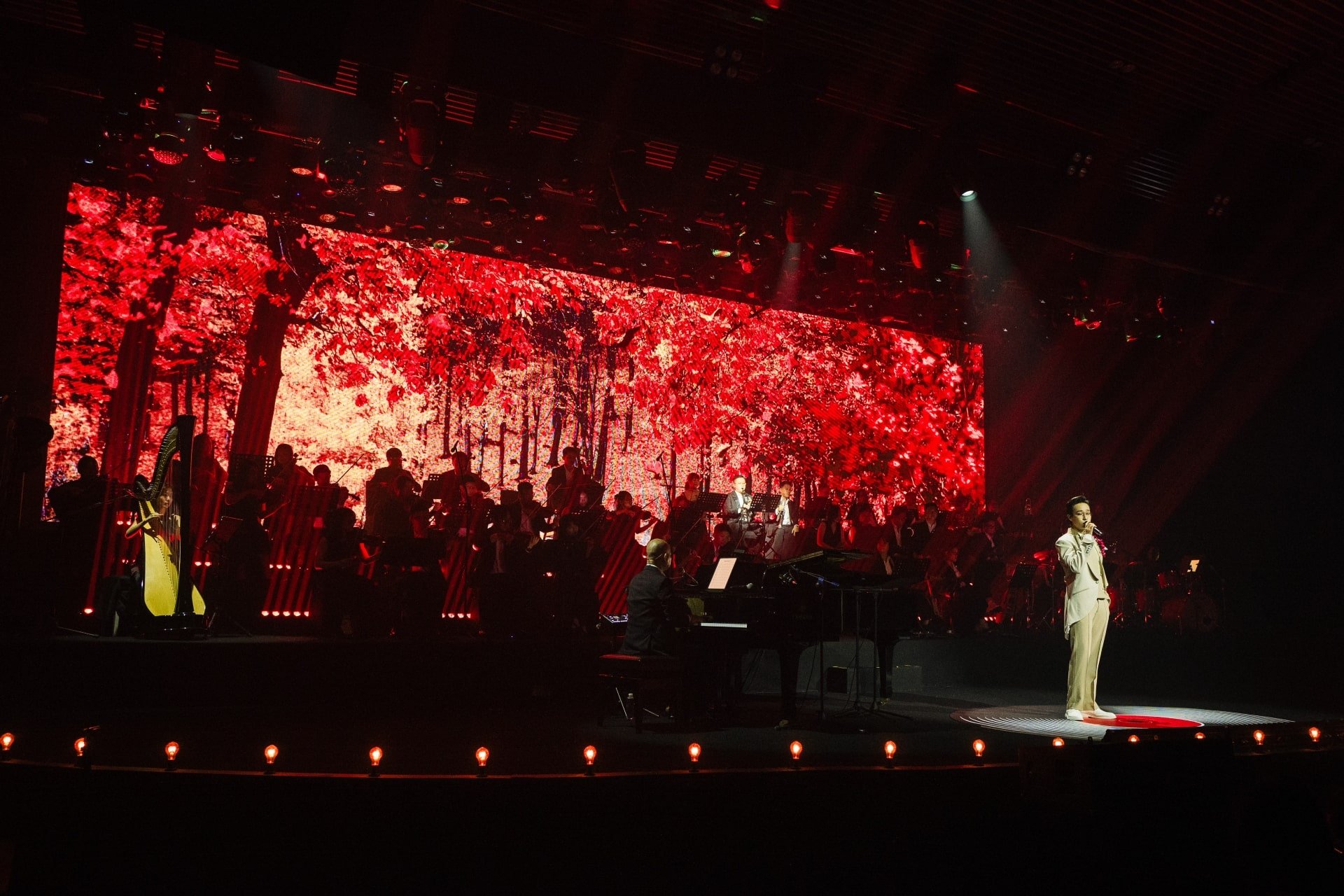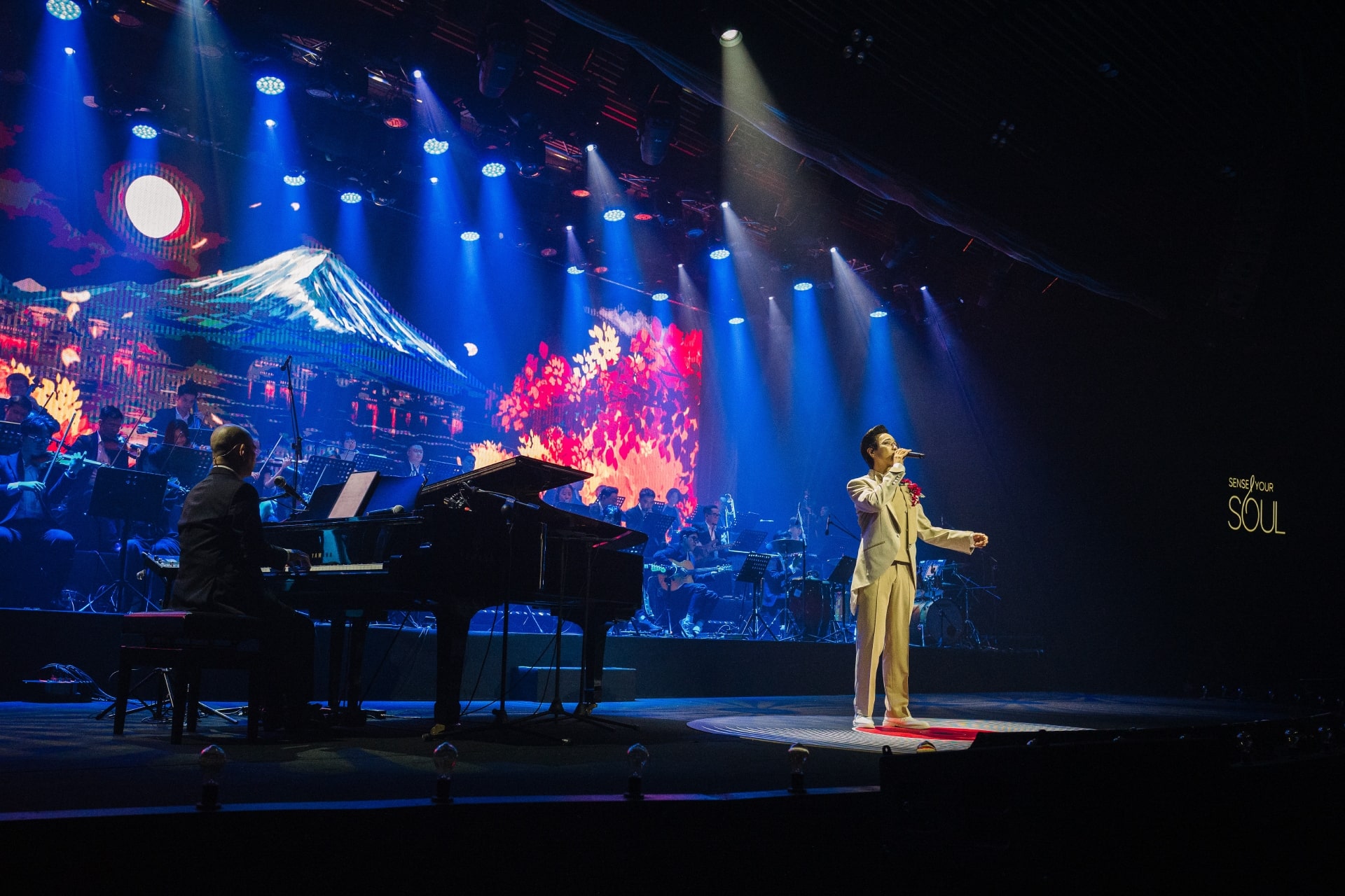 The mood then brightened as Ha An Huy brought “Phố xa” to life in a new arrangement, including a Japanese verse and stage visuals inspired by the colors of an Eastern autumn — both novel and familiar.